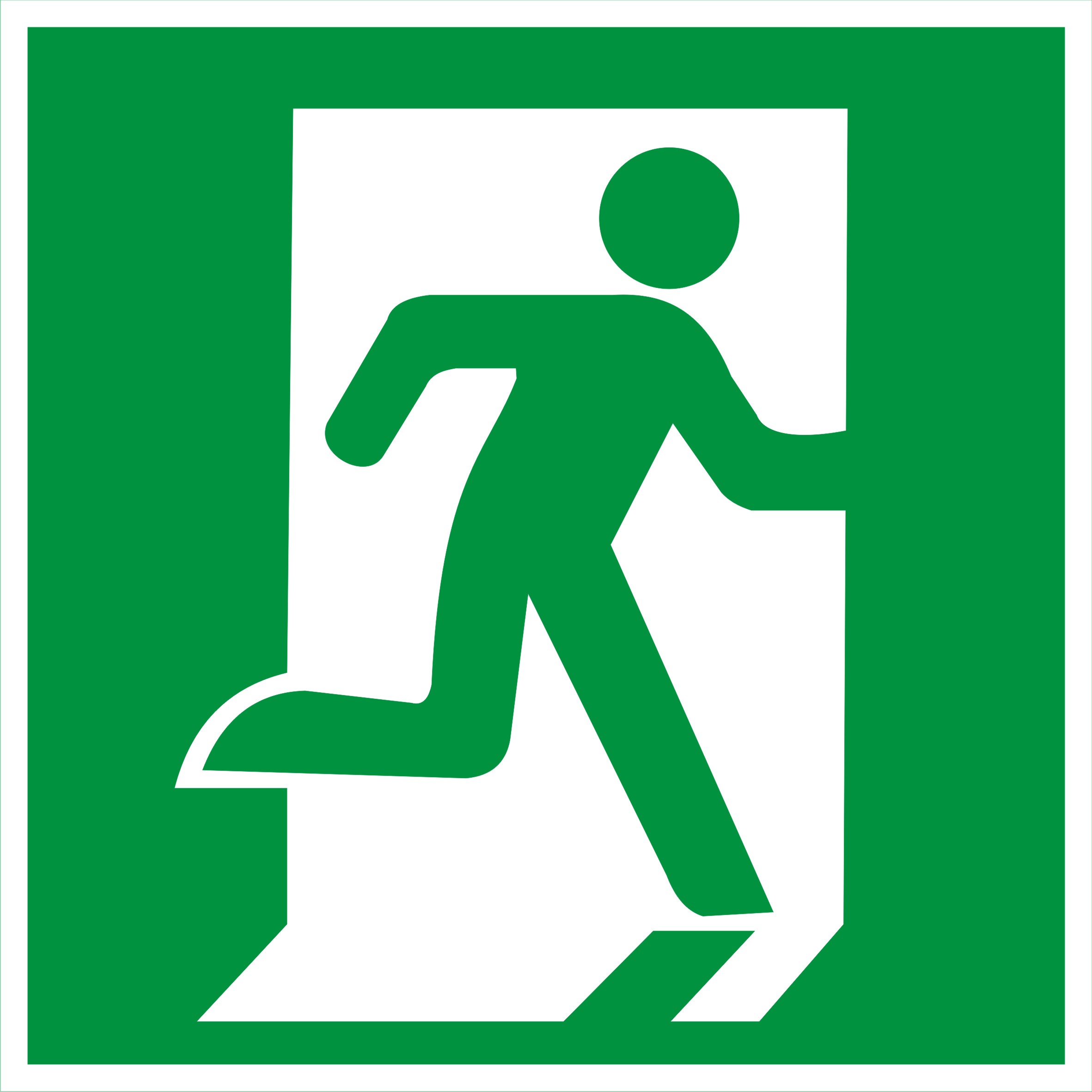 Над дверями (или на дверях) эвакуационных выходов, открывающихся с левой стороны. На стенах помещений вместе с направляющей стрелкой для указания направления движения к эвакуационному выходу.